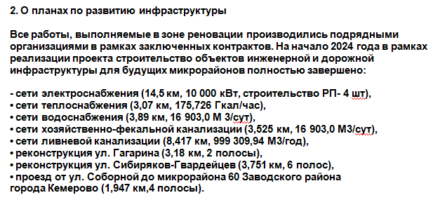 По данным администрации Кемерова, уже реализованы значительные объекты инфраструктуры. Построены сети электроснабжения протяженностью 14,5 километров с мощностью 10 000 киловатт и четырьмя распределительными подстанциями и другие объекты комплексной городской инфраструктуры.