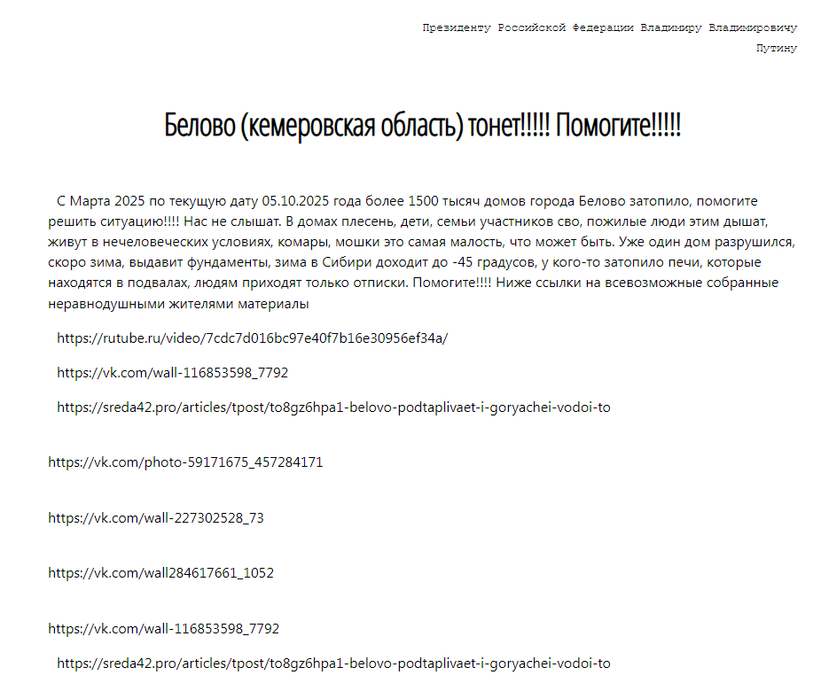 Беловчане сформировали петицию, адресованную президенту России Владимиру Путину, в которой просят помощи с решением проблемы с подтоплениями жилых домов.