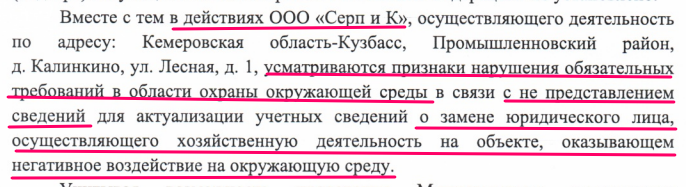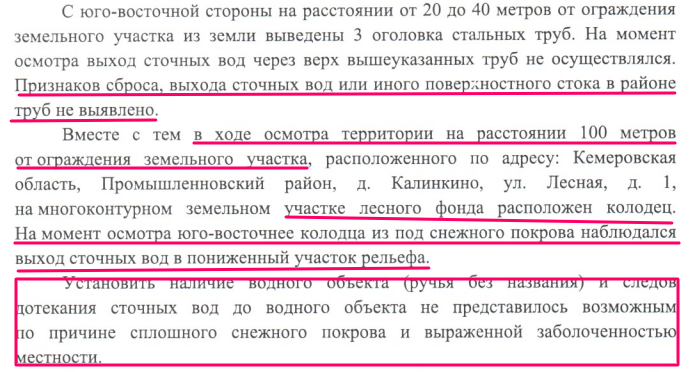 Сотрудники министерства природных ресурсов и экологии Кузбасса провели выездное обследование прилегающей к пивзаводу местности. В ходе осмотра в березняки были обнаружены три оголовка стальных труб, однако на момент проверки сброс сточных вод через них не осуществлялся. Также специалисты отметили наличие колодца на расстоянии 100 метров от ограждения предприятия, где наблюдался выход сточных вод в пониженный участок рельефа.