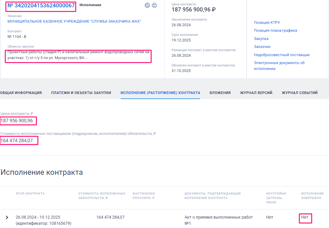 В рассматриваемом арбитражем деле исковые требования связаны с исполнением контракта №3420204153624000067 "Выполнение проектных работ (стадия Р) и капитальный ремонт водопроводных сетей на участках: 1) от г/у 5 по ул.Мусоргского, ВК-5384 до ВК3985 по ул. Киевская, 522) от ВК-4523 по ул.Тухачевского,7 до ВК-4645 по ул.Тухачевского, 22 по адресу: Российская Федерация, Кемеровская область — Кузбасс, Беловский городской округ, пгт Новый Городок". При этом изначальная стоимость контракта составляла около 188 миллионов.