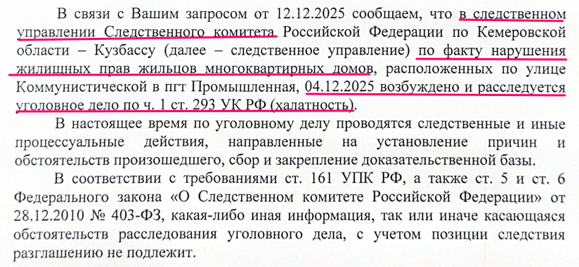 Напомним, в 2025–2026 годах в Кузбассе стартовала новая программа переселения граждан из многоквартирных домов, признанных аварийными после 1 января 2017 года. Программа была утверждена правительством региона 11 сентября 2025 года. К большому разочарованию жителей домов №70 и №72 по улице Коммунистической (оба дома 1961 года постройки), они не попали в эту программу. Более того, при обращении граждан в Министерство строительства Кузбасса выяснилось, что от администрации Промышленновского округа вообще не поступало заявок на включение этих домов в программу переселения.