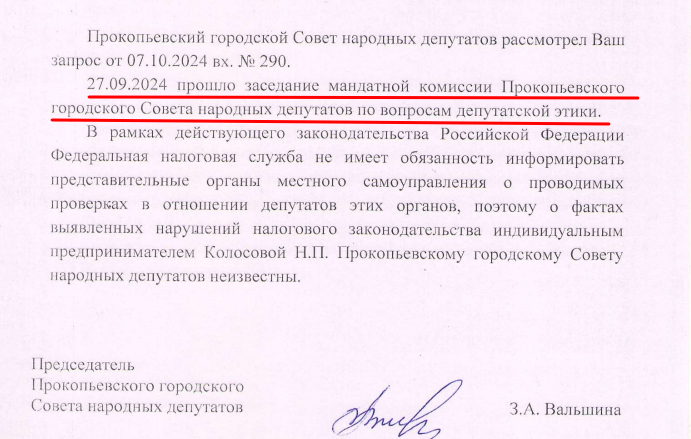 Из горсовета пришёл сухой ответ: "27.09.2024 прошло заседание мандатной комиссии Прокопьевского городского Совета народных депутатов по вопросам депутатской этики". Всё, точка. Какое решение было принято - об этом ни слова.