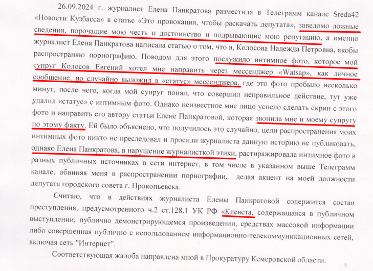 После серии материалов "Среды 42" о скандале вокруг публикации супругом прокопьевского депутата Надежды Колосовой Евгением её интимной фотографии в статусе мессенджера и последующих после этого телефонных переговоров с самой Надеждой Петровной и её мужем, редакция направила официальный запрос в Совет народных депутатов Прокопьевска с вопросом, будет ли рассмотрено неэтичное поведение коллеги, в частности, её наказы журналисту по фальсификации источника распространения порнографического снимка.
