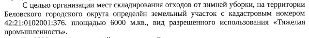 Официальная позиция администрации Беловского городского округа иная. По данным властей, для складирования снега от зимней уборки определён специальный участок площадью 6000 квадратных метров.