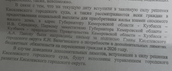 После завершения программы ГУРШ получить соцвыплаты за ветхое жильё стало сложнее. Поэтому главы семейств были вынуждены обратиться в суд с исками к Управлению городского развития Киселёвского городского округа. Осенью прошлого года суды встали на сторону истцов. Но до сих пор ни семья Тихоновых, ни Паршуткиных не получила выплаты, несмотря на исполнительные листы на руках.