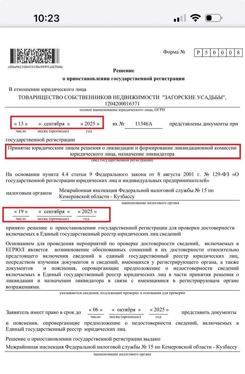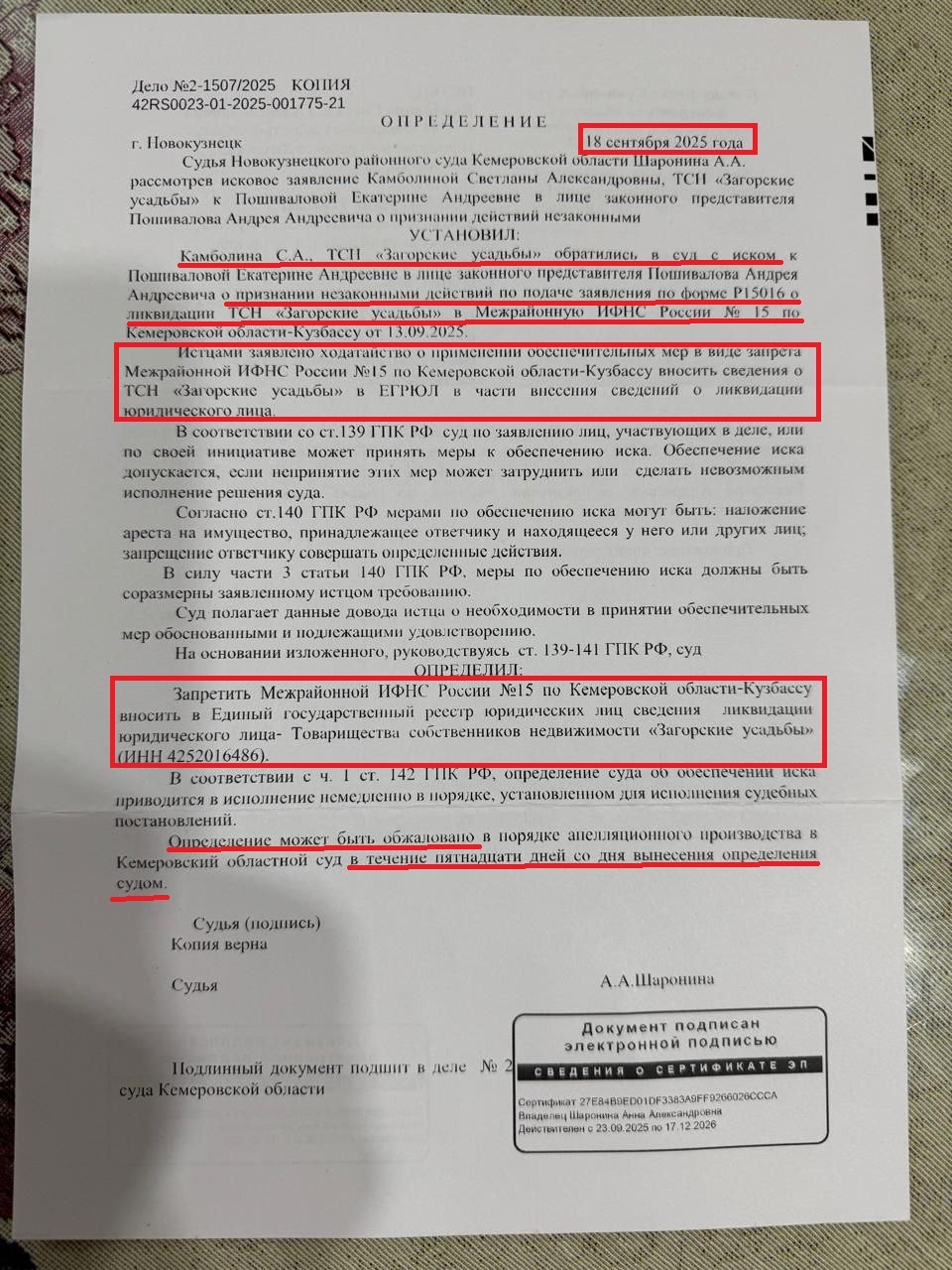 В сентябре собственники организовали собрание, подписали бюллетени и 51% проголосовали за ликвидацию ТСН. Новый председатель-ликвидатор 13 сентября направил в налоговую документы, заверенные нотариусом, о ликвидации ТСН "Загорские усадьбы". Но Камболина обратилась в Новокузнецкий районный суд и уже 18 сентября судья вынесла определение.