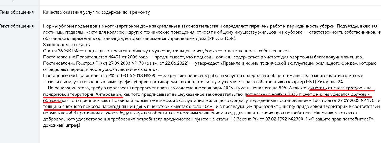 Собственник одной из квартир Игорь Ермолов 23 января написал претензию в ГИС ЖКХ на работу управляющей компании по уборке территории от снега и потребовал перерасчёта платы за содержание мест общего пользования.