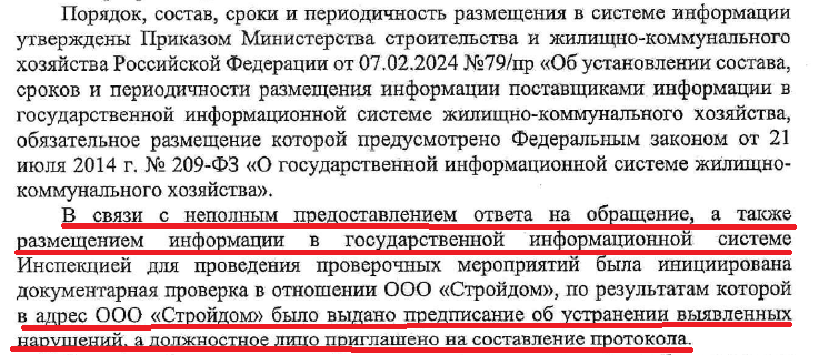 "Обращаться в Госжилинспекцию бесполезно, по опыту говорю. Весной прошлого года пожаловался в ГЖИ, что "Стройдом" нарушает порядок размещения информации в государственной информационной системе ЖКХ. За такое нарушение предусмотрены штрафы. Но инспекция ограничилась предписанием. Обращает внимание фразу в ответе "должностное лицо приглашено на составление протокола", - отмечает Игорь.