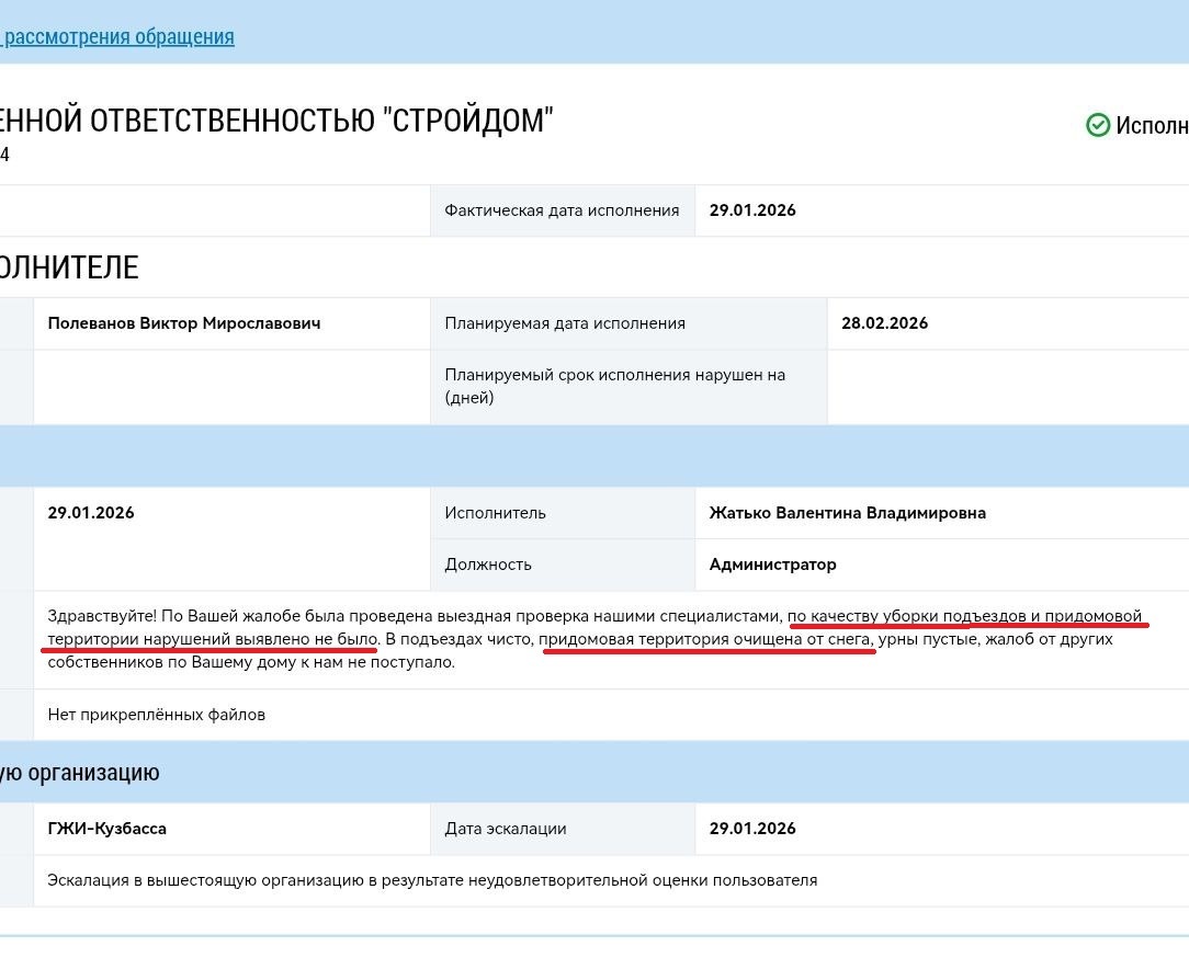 Ответ на жалобу поступил 29 января - нареканий в работе УК нет.