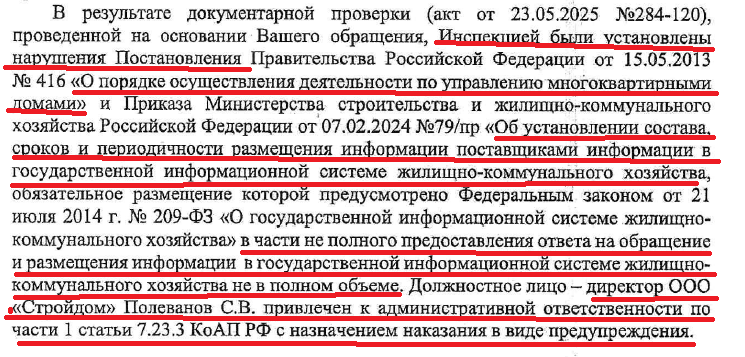 Ермолов повторно обратился в ГЖИ и указал на несоразмерность наказания совершенным "Стройдомом" нарушений. На что получил ответ.