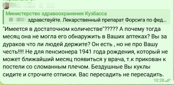 «На данный момент она у нас с переломом плеча и прийти за новым рецептом не сможет. Т.е теперь на несколько месяцев про льготный препарат забываем. Мы, конечно, купим, как и многие пенсионеры этот препарат, хоть и не дешево. Но почему вы так и не можете отладить этот процесс? Это издевательство над старыми, больными людьми. Зачем вы их гоняете и "кормите завтраками"? Они как на работу в эти аптеки ходят. Научитесь уже говорить правду людям. Динамить вы уже научились безупречно. Противно», - пишет автор комментария.