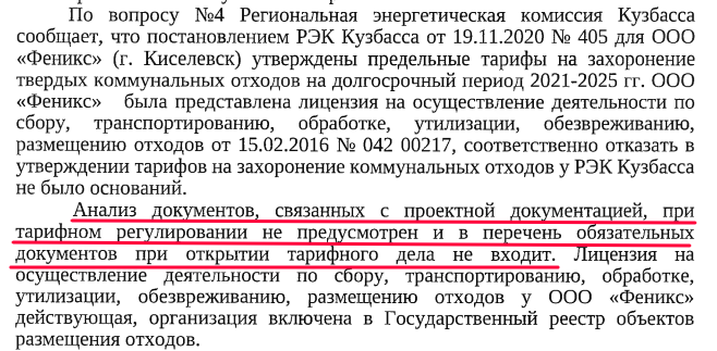 Если полигон ТКО включён в госреестр и осуществляет приём мусора, то РЭК Кузбасса должен утвердить для эксплуатирующей полигон организации тариф. Но полигон работает по проекту 1997 года. За три десятка лет требования природоохранного законодательства радикально изменились. Вряд ли карагайлинский полигон соответствует современным экологическим требованиям. Тогда каким образом РЭК утвердил для ООО "Феникс" тариф? Всё просто.