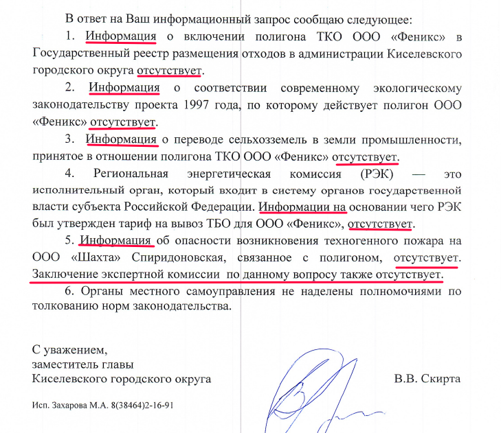 И только в администрации Киселёвского городского округа, на территории которого функционирует полигон ТКО "Феникс", не смогли ответить ни на один поставленный редакцией вопрос. Официальный ответ мэрии достоин быть опубликованным без купюр.