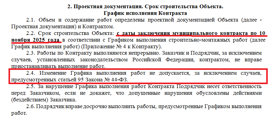 Вероятно, отставание оказалось настолько критичным, что 16 сентября заключается допсоглашение и сроки исполнения контракта сдвигаются на месяц, с 10-го ноября на 9-е декабря. Впрочем, есть опасение, что и к началу декабря работы не будут выполнены. При этом в первоначальной версии документа в п. 2.4 указано, что "изменение Графика выполнения работ не допускается, за исключением случаев, предусмотренных статьей 95 Закона № 44-ФЗ". Что за случай, предусмотренный федеральным законом, послужил причиной изменения графика, выяснить не удалось.