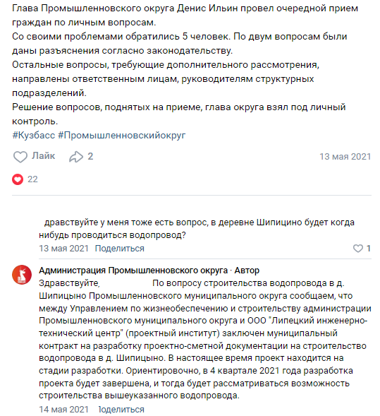 Справедливости ради, в мае 2021 года в соцсетях Промышленновского района чиновникам был задан вопрос о строительстве водопровода в Шипицино.