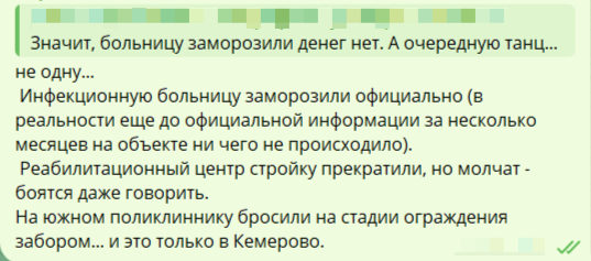 Кузбассовцы всё чаще выражают недовольство из‑за приоритетов в сфере строительства: на фоне заморозки ряда важных медицинских объектов в регионе активно идёт возведение масштабных культурно‑образовательных комплексов.