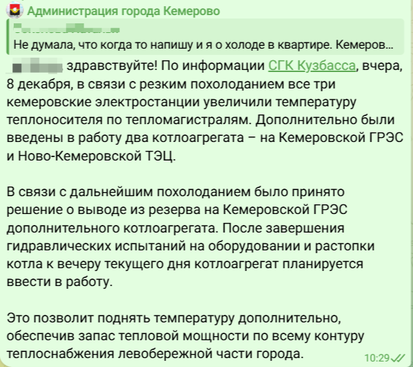 Представители администрации ответили, что в связи с дальнейшим похолоданием было принято решение о выводе из резерва на Кемеровской ГРЭС дополнительного котлоагрегата, однако перед запуском необходимо провести гидравлические испытания.