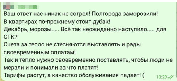 «Энергетики, конечно, молодцы! Только возникает вопрос: что за резерв такой же которому надо проводить испытания? А если испытания не пройдут, замерзай город?! Что за организация работ по подготовке к отопительному сезону?! Про похолодание только узнали или думали и так сойдёт? Почему резерв не готов к работе?! Страшно подумать, что было бы если установилось -40 на неделю, полгорода бы замерзло! Может пора к ответственности привлекать руководство СГК?»