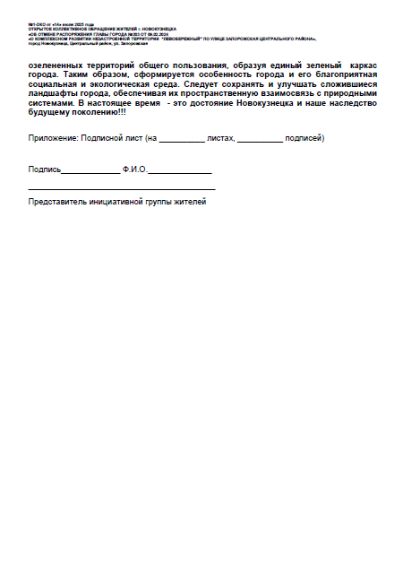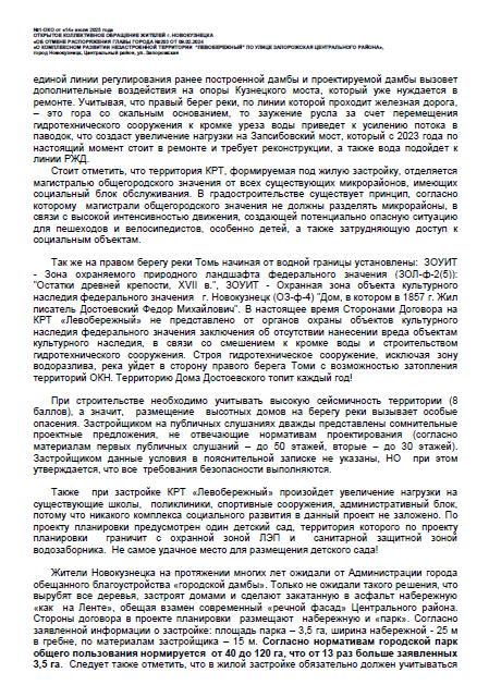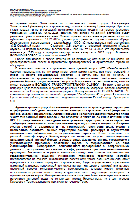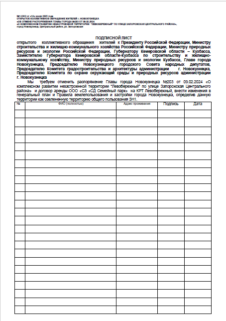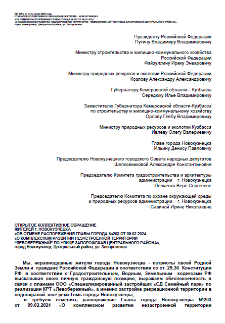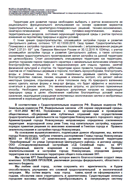Завершена работа над петицией в адрес президента Владимира Путина, правительства РФ, губернатора и представителей органа местного самоуправления Новокузнецка, в чьей компетенции находится возможность остановить проект застройки КРТ «Левобережный».