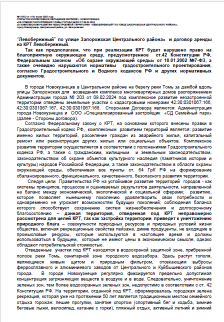 При этом новокузнечане выступают за развитие родного города. Они требуют рассмотреть альтернативные площадки для строительства многоквартирных домов вместо территории проекта КРТ «Левобережный». Главное, чтобы для предполагаемого строительства не возникала бы необходимость изъятия и уничтожения существующих естественным образом сложившихся рекреационных озелененных территорий массового отдыха горожан.
