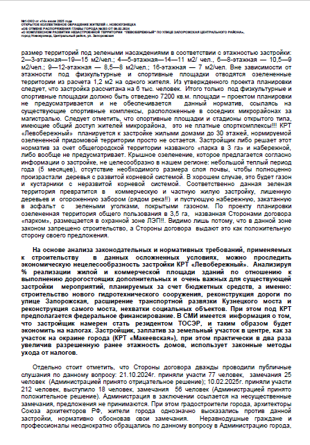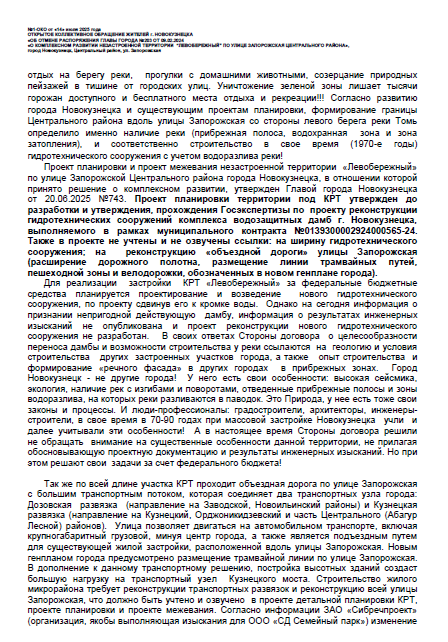 В качестве аргументов общественники приводят факты нарушения действующих законов и градостроительных норм. Предполагается, что реализация проекта должна дать толчок развитию территории, но экономическая целесообразность застройки КРТ «Левобережный» с учетом приведенных новокузнечанами доводов оказывается под большим сомнением.