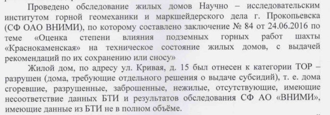 "Поскольку в отношении указанного жилого дома специализированной экспертной организацией решение о признании жилья ветхим и непригодным для проживания по критериям безопасности в результате ведения горных работ на ликвидируемых шахтах не принято, данный дом не мог быть переселен по программе содействия в переселении за счёт средств федерального бюджета (межбюджетных трансфертов)", - говорится в ответе администрации КГО на запрос "Среды".