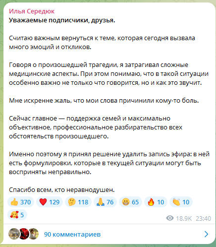 На том же прямом эфире губернатор признал ошибки оптимизации медицины и заявил о её приостановке. Фактически Середюк взял на себя ответственность за исправление накопившихся проблем.