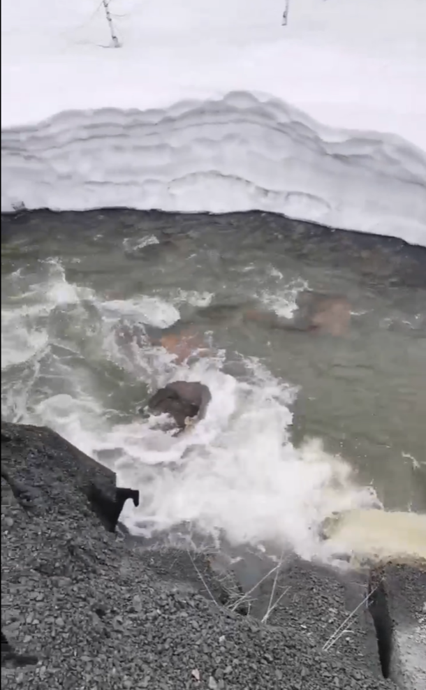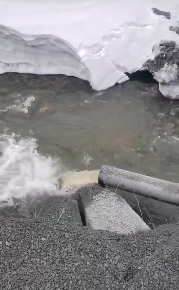 Общественники обнародовали кадры, на которых видно, что выше места сброса вода в реке остаётся чистой - особенно заметно это весной. Однако сразу после участка, куда поступают стоки из трубы шахты, качество воды резко падает: цвет и прозрачность явно свидетельствуют о загрязнении.
