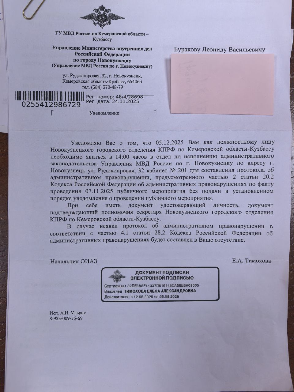 В Новокузнецке разворачивается поистине детективная история, достойная пера мастера криминального жанра. Секретарь местного отделения КПРФ Леонид Бураков получил весьма интригующее уведомление от местных правоохранительных органов.