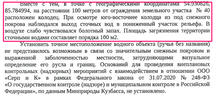В ходе проверки 3 декабря инспекторы Министерства природных ресурсов и экологии Кузбасса обнаружили комплекс зданий с вывеской "Калинкино инди-пивоварня". Территория оказалась огорожена, доступ ограничен. Особое внимание привлекли три оголовка стальных труб, расположенных в юго-восточной части участка. Хотя на момент проверки прямого сброса сточных вод не зафиксировали, однако в ста метрах от предприятия был обнаружен проблемный колодец.