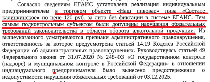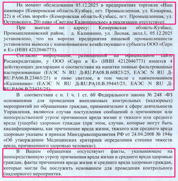 Любопытно, что ответ непосредственно от Роспотребнадзора поступил в редакцию на день раньше, 8 декабря. Согласно документу, выездную проверку торговых точек и пивзавода ведомство провело 5 декабря, на два дня позже инспекции минприроды.