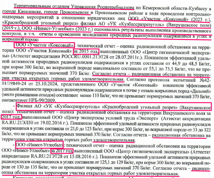 К слову, в Киселевске, где на 85 тысяч жителей 8 разрезов, обогатительные фабрики и куча углепогрузок, нет аккредитованной лаборатории Роспотребнадзора, которая могла бы провести нужные экспертизы загрязнения радиоактивными элементами, некоторыми тяжёлыми металлами и другими ядовитыми веществами. Вместо проведения лабораторных исследований санитарное ведомство оценивает результаты производственного контроля самих предприятий, причём, выполненные 7-10 лет назад.