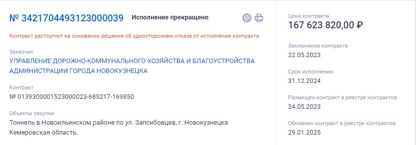 Новосибирская компания "СпецТрансСтрой" получила печальную известность в Новокузнецке после того, как сорвала сроки капремонтов Новоильинского тоннеля и Запсибовского моста. Напомним, в 2023 году компания получила два крупных контракта на общую сумму более 500 миллионов рублей для капитального ремонта объектов. Планировалось завершить работы к середине 2024 года, но подрядчик не справился со своими обязательствами. В результате контракты были расторгнуты, компания попала в реестр недобросовестных поставщиков.