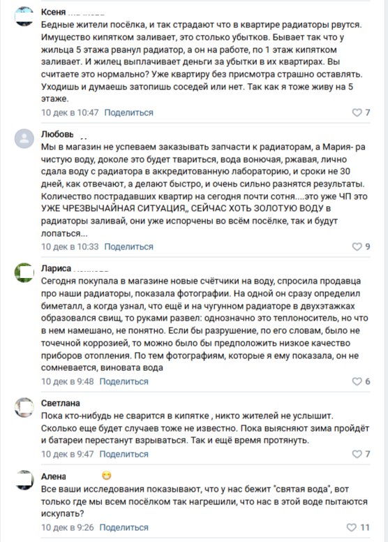 В социальных сетях жители посёлка рассказывают, что разрушаются преимущественно алюминиевые радиаторы, но есть примеры разрушения приборов отопления из биметалла и даже из чугуна. Чиновники упорно перекладывают ответственность на жителей, дескать, не надо было покупать дешёвые радиаторы, а те, что куплены надо промывать и регулярно менять. Но это уже вторичная причина разрушения. Первичная причина – вода, уверены пострадавшие. И да, первыми её качество не выдерживают дешёвые радиаторы. Но рвутся они не от того, что дешевы, а от того, что теплоноситель сомнительного качества.