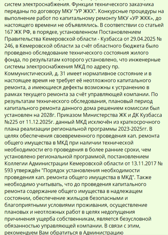 Кузбассовцы объясняют задержки с капремонтом несколькими причинами. Во‑первых, часто утрачена или «обнулена» в ходе реформ проектная документация по таким домам. Во‑вторых, решения порой принимают на основании подзаконных актов (например, постановлений правительства), что может противоречить нормам Жилищного кодекса РФ. В‑третьих, при обследовании сети формально признают «нормативными», а обнаруженные дефекты относят к тем, что можно устранить в рамках текущего ремонта силами управляющей компании.