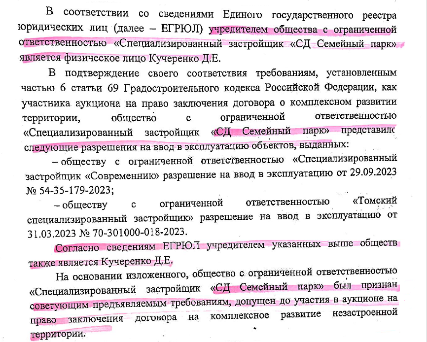 Новокузнецкая мэрия в ответе на депутатский запрос разъяснила основания, по которым ООО "Специализированный застройщик "СД "Семейный парк" было допущено до торгов и как единственный участник, получило право застройки участка на левобережье. Согласно ч. 6 ст. 69 Градостроительного кодекса РФ, участником торгов может являться юридическое лицо при условии, что либо его учредитель или любое из его дочерних обществ имеет за последние пять лет, предшествующих дате проведения торгов, опыт участия в строительстве объектов капстроительства в совокупном объеме не менее 10% от объема строительства, предусмотренного решением о комплексном развитии территории.