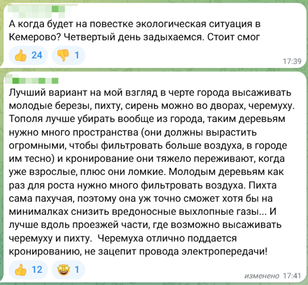 Комментаторы разразились недовольством: кузбассовцы требуют обратить внимание властей на экологию в Кемерове, Прокопьевске и Полысаеве. Кто-то предложил высаживать больше деревьев для улучшения качества воздуха, кто-то же уверен, что основная проблема в промпредприятиях, которые не используют уже имеющуюся у них газоочистку в полной мере.