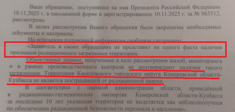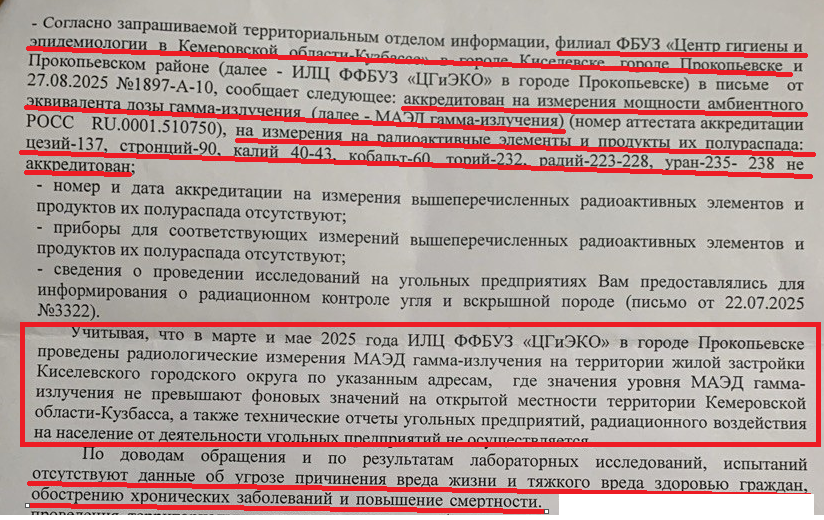 Напомним, жители Киселёвска неоднократно выражали беспокойство по поводу радиационной безопасности. Они указывали на близость угольных разрезов, отвалов и шахт к жилым районам. В 2025 году жительница Марина Процман обратилась в Следственный комитет с требованием провести экспертизу образцов угля и горных пород с трёх крупных разрезов (ООО "Участок Коксовый" ПМХ, филиал АО УК "Кузбассразрезуголь" "Краснобродский угольный разрез", ООО "Инвест-Углесбыт"). Однако на её жалобу не последовало реакции.