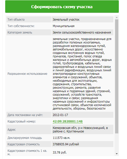 Кадастровый номер участка сельхозназначения, на котором можно добывать полезные ископаемые, строить дороги, возводить объекты космической деятельности - 42:09:2820001:148. Находится он в районе села Кругленькое. Форма собственности - муниципальная. На этом участке построена дорога, которая ведет к полигону, где складируются твердые коммунальные отходы значительной части юга Кузбасса.