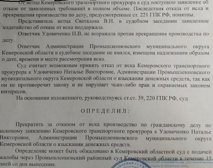 В мае 2025 года Кемеровский транспортный прокурор подал иск против бывшего председателя КУМИ Натальи Удовиченко, которую ранее обвинили в превышении должностных полномочий, о взыскании имущественный ущерб, который она причинила Промышленновскому муниципальному округу, в размере 4 943 446 руб.