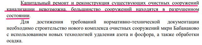 Серьезные проблемы и на очистных сооружениях ключевых районов города. Очистные в пгт Новый Городок, построенные в 1957 году, и комплекс в микрорайоне Бабанаково (1965 год) находятся в аварийном состоянии. Железобетонные конструкции разрушаются, стальные элементы подвержены сильной коррозии. Требуется строительство новых очистных с современными технологиями очистки.