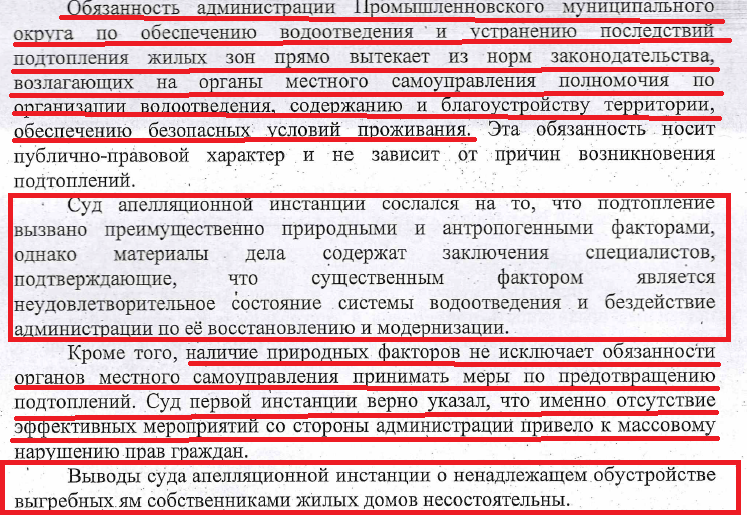 Выводы суда апелляционной инстанции о том, что администрация обязана лишь создавать условия, необходимые для организации водоотведения, противоречат действующему законодательству, говорится в кассационном определении. Суд первой инстанции обоснованно указал, что отсутствие системных мероприятий нарушает права граждан на благоприятные и безопасные условия проживания, гарантированные Конституцией Российской Федерации и федеральными законами. Суд апелляционной инстанции не дал оценки многолетнему характеру проблемы и её социальной значимости.