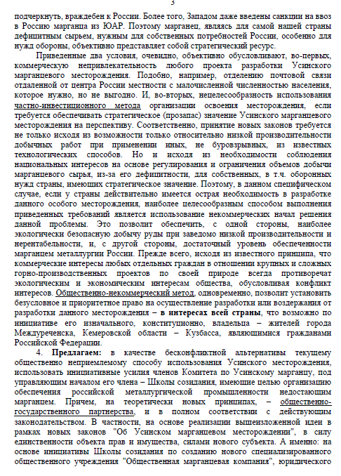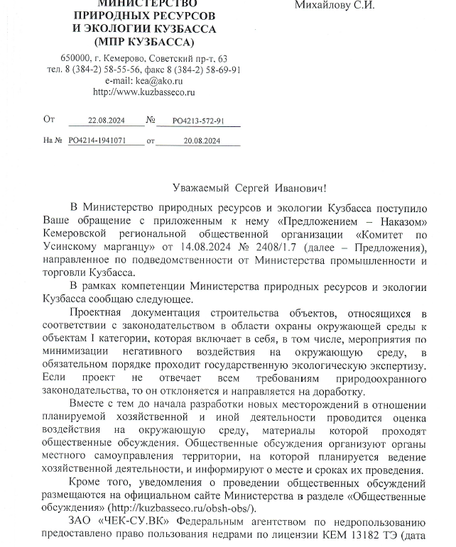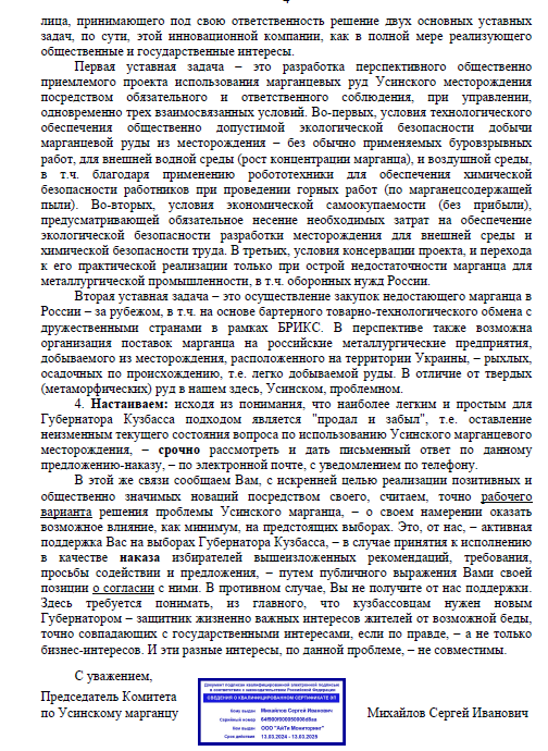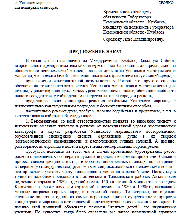 От лица КРОО «Комитет по Усинскому марганцу» врио губернатора Кемеровской области-Кузбасса Илье Середюку был направлен предложение-наказ об Усинском марганце для поддержки на выборах.