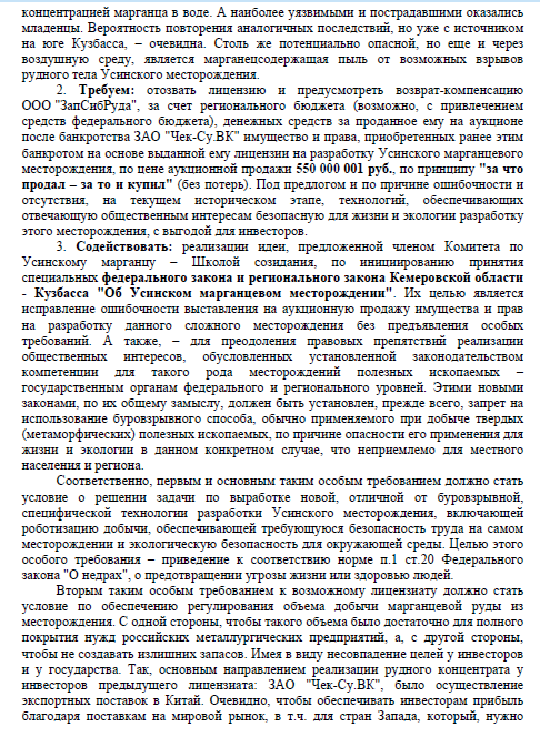 В своем предложении-наказе председатель КРОО «Комитет по Усинскому марганцу» Сергей Михайлов привел весьма убедительные доводы против разработки Усинского месторождения марганца и предложил консервацию проекта, и перехода к его практической реализации только при острой недостаточности марганца для металлургической промышленности, в т.ч. оборонных нужд России. Позиция «Комитета» - учитывая все риски, связанные с добычей марганцевой руды на реке Уса, разработка месторождения допустима лишь с исключением ведения буровзрывных работ и лишь в объемах необходимых для российской промышленности.ЗАО «ЧЕК-СУ ВК» ориентировалось на экспортные поставки сырья. Планы ООО «ЗапСибРуда» пока туманны, что вызывает дополнительную озабоченность.