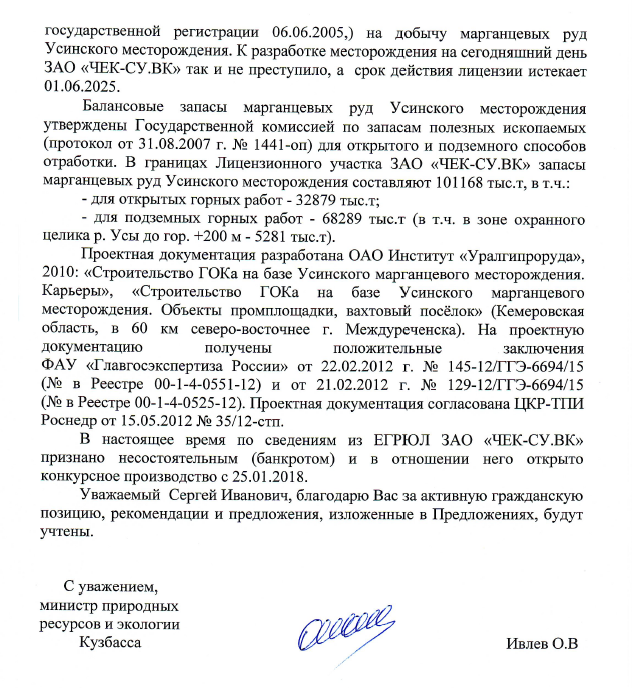 В региональном Минприроды, похоже, прочитали только заголовок письма и рассказали о том, какие разрешительные документы были у ЗАО «Чек-СУ ВК», ни словом не упомянув про ООО «ЗапСибРуда». В Минприроды не знают, что у имущества ЗАО теперь собственник ООО? Или ответ-отписка был дан умышленно в рамках подковерных предвыборных игр в правительстве региона, ведь Междуреченск славен легкими на подъем массовыми протестными акциями?