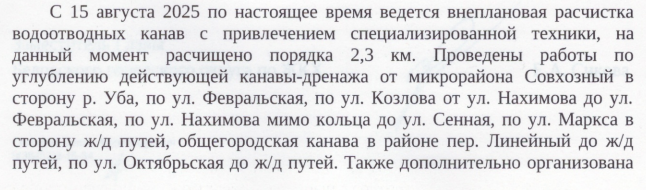 Расчистка водоотводных канав с привлечением специализированной техники продолжается, говорится в ответе администрации. До 20 сентября планируется расчистить и углубить участок ливневой канавы за улицей Мелиораторов через улицу Овощную вдоль улицы Халтурина, участок от улицы Волошиной, 26 до улицы Февральской, а также заменить водопропускную трубу на участке от улицы Щербакова до улицы Кемеровская.