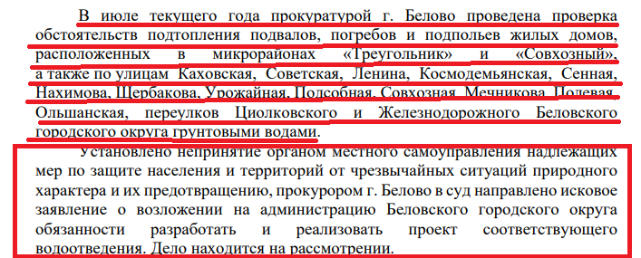 По данным чиновников, на территории Беловского городского округа имеется водопонижающий комплекс, который состоит из 9 водопонижающих скважин, расположенных в районах "Треугольник" и Совхозный. Комплекс оборудован глубинными насосами, которые находятся в исправном состоянии и откачивает в сутки 841,5 кубометр воды из водопонижающих скважин. Иных водопонижающих насосов не имеется.