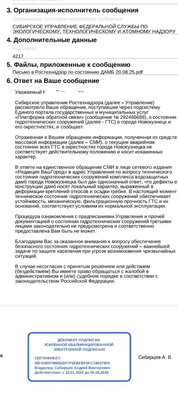 В социальных сетях появился ответ Ростехнадзора, в котором черным по белому написано, что информация, полученная из СМИ о текущем аварийном состоянии всех ГТС в окрестностях Новокузнецка, не соответствует действительному положению и носит искаженный характер. Дефекты в конструкции дамб носят локальный характер, выраженный в деформации креплений откосов и осадки гребня. В настоящий момент Техническое состояние гидротехнических сооружений обеспечивает устойчивость механическую, фильтрационную прочность ГТС и их оснований, соответствует условиям их нормальной эксплуатации.