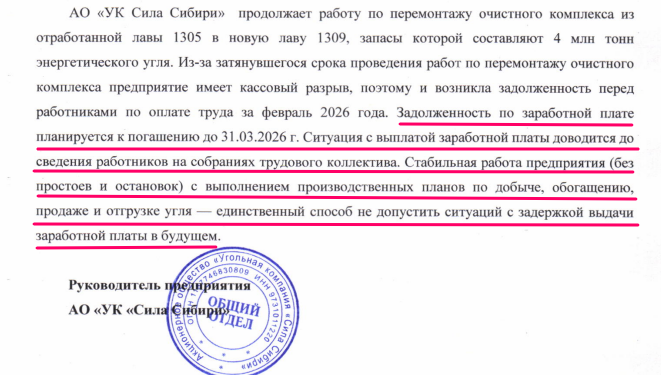 Работники АО УК "Сила Сибири" в Полысаево с февраля сталкиваются с задержками зарплат. Февральский аванс, который должен был поступить 28 февраля, шахтёры получили только 4 марта. Зарплата за февраль, которую ожидали с 13 марта, до сих пор не перечислена.