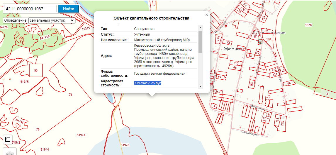 По официальным данным все объекты находятся в государственной федеральной собственности и собственности публично-правовых образований. Кадастровые документы подтверждают не только принадлежность, но и внушительную стоимость имущества. Яркий пример - магистральный трубопровод МКр, расположенный юго-восточнее Уфимцево.
